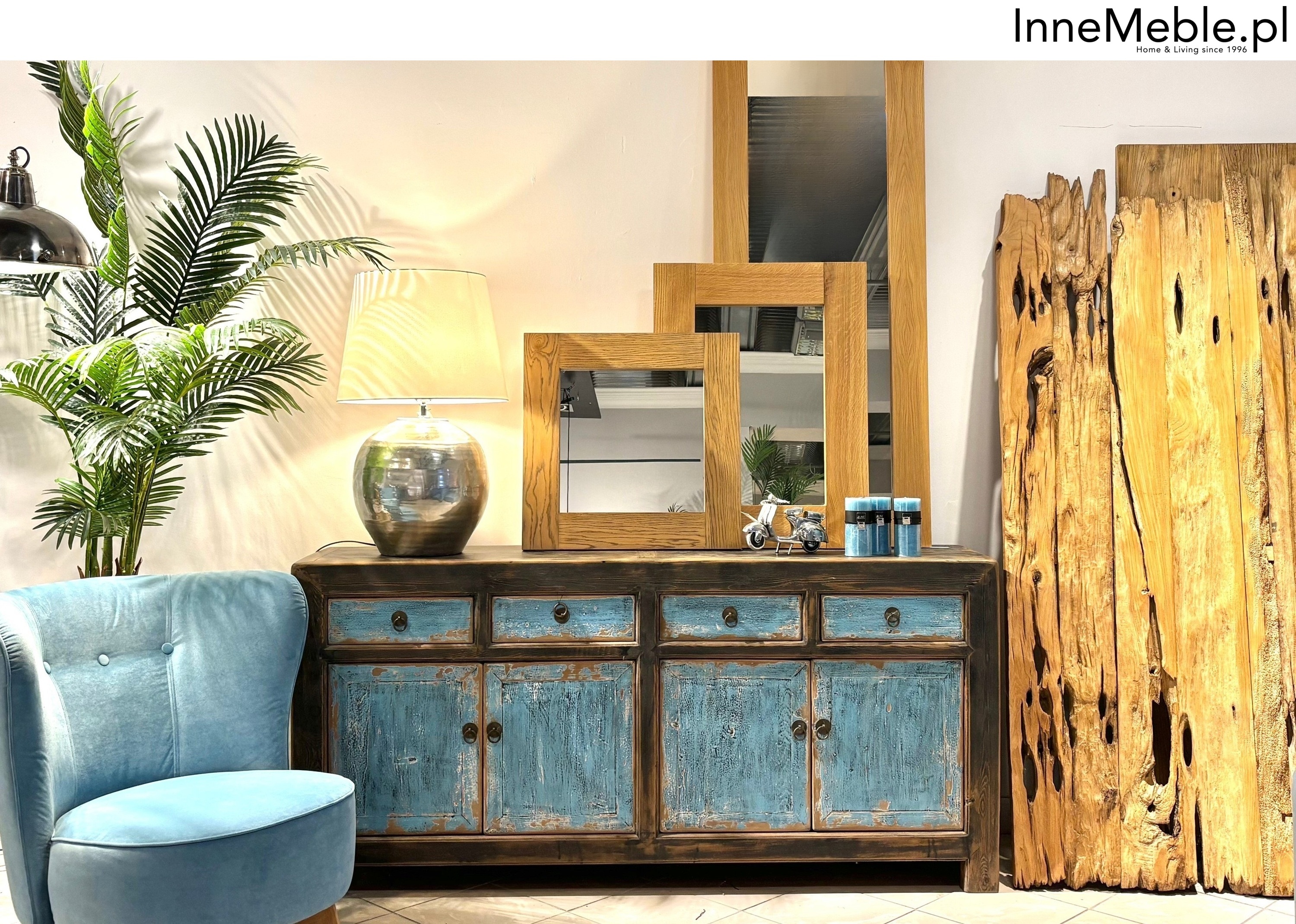 Drewniana komoda błękitna. Aranżacja w stylu boho. Niebieski fotel obrotowy Carmen. Palmy we wnętrzach. Lustra w drewnianych ramach. Drewniane dechy dekoracja