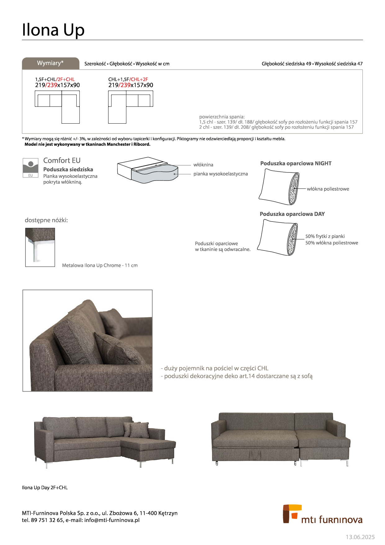 Ilona Up to mebel o nowoczesnej bryle. Powstała w odpowiedzi na potrzeby współczesnych odbiorców, związane z łączeniem w jednym meblu funkcji siedziska, zapewniającego wygodny wypoczynek w gronie przyjaciół czy rodziny, a jednocześnie gwarantującego domownikom komfortowy sen. Ilona Up to sofa, który pozwala bardzo szybko zmieniać funkcje mebla. Mimo sporej powierzchni do siedzenia i wypoczywania, we wnętrzu prezentuje się zgrabnie i lekko. Obszerny, ergonomiczny pojemnik na pościel to również mocna strona tego mebla. Sofa nie jest wykonywana w tkaninie Hombre. W wersji skórzanej wysuwany wózek występuje tylko w tkaninie.