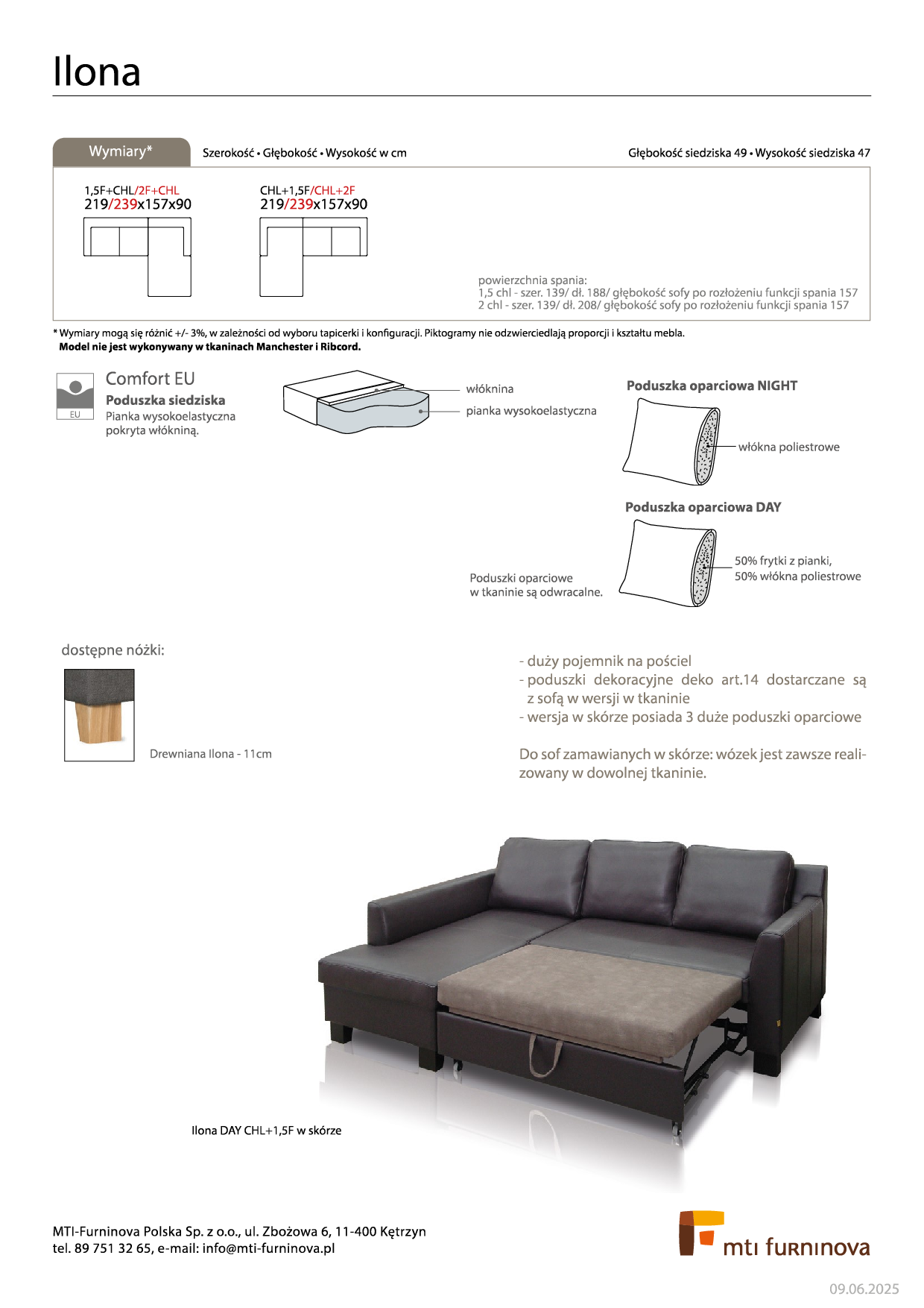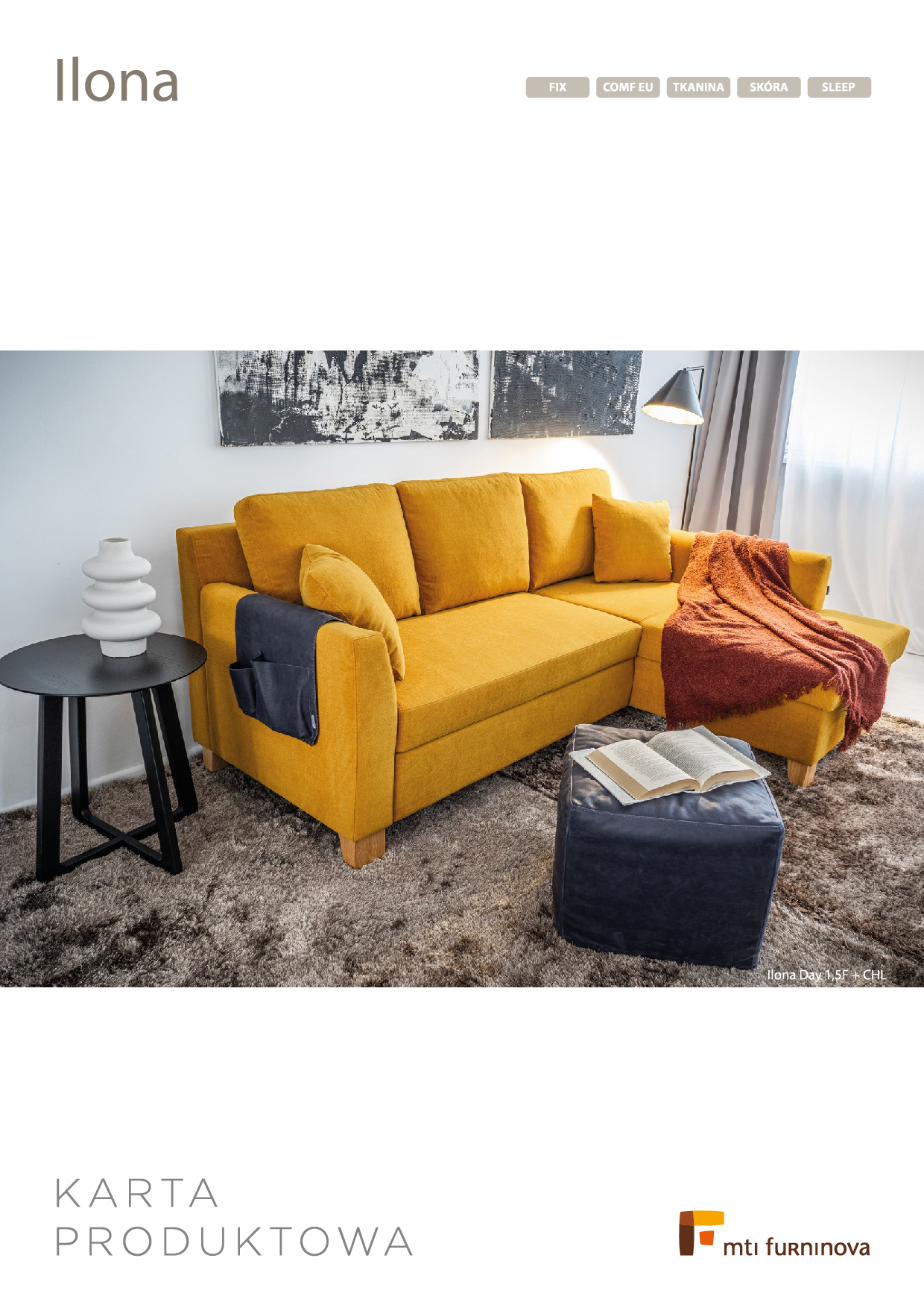 Sofa Ilona jest znakiem naszych czasów i kwintesencją praktycyzmu. Prosta, wręcz kanciasta forma i wielofunkcyjność mebla nie pozbawia go atrakcyjności. Projektantowi zależało na tym, aby stworzyć model poszukiwany przez większość użytkowników, tzn. mebel do wygodnego siedzenia, komfortowego spania i bezawaryjnej, szybkiej zmiany tych funkcji, a także z obszernym pojemnikiem na pościel. I to mu się znakomicie udało. Sofa nie jest wykonywana w tkaninie Manchester i Ribcord. W wersji skórzanej wysuwany wózek występuje tylko w tkaninie.