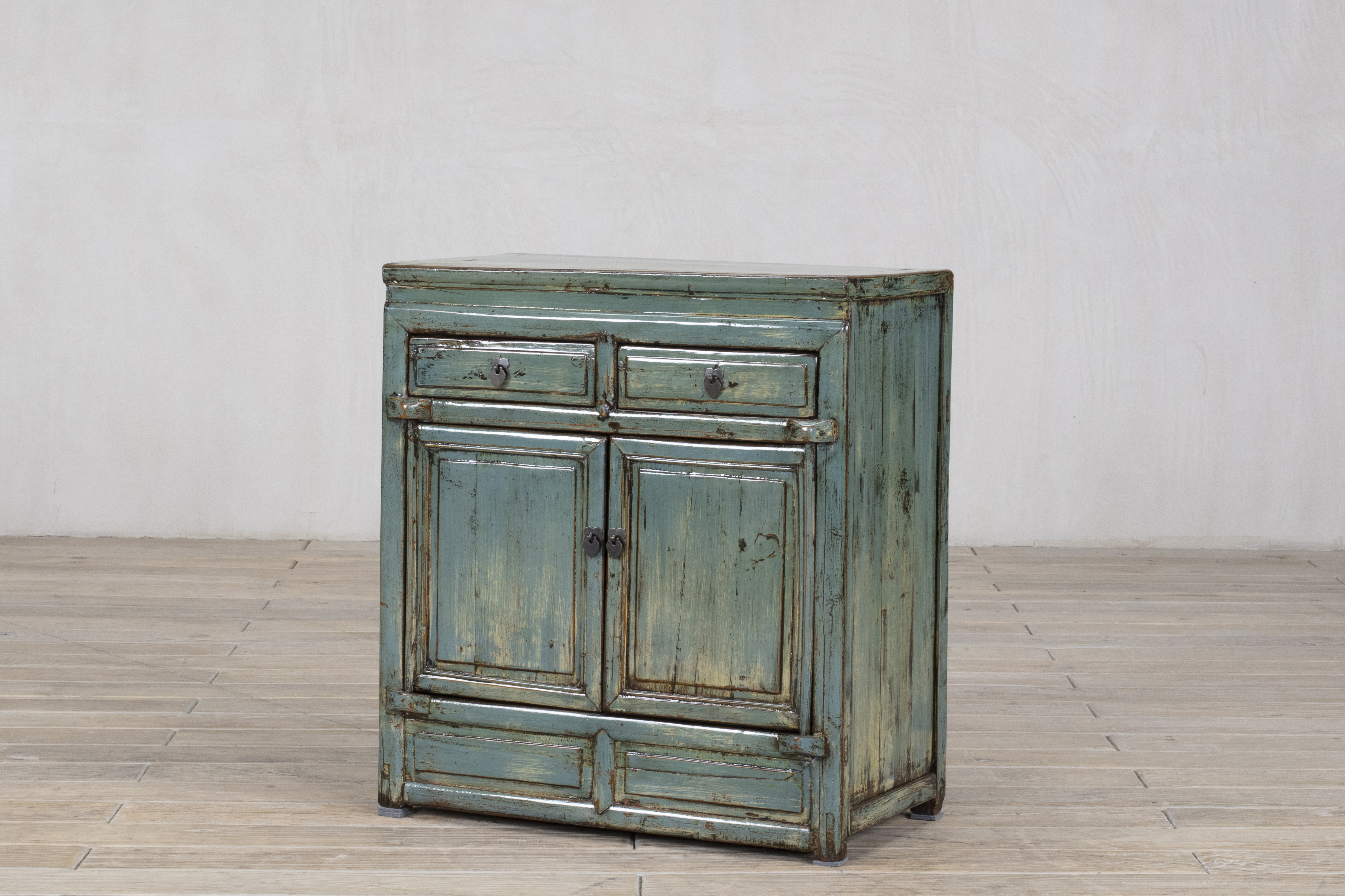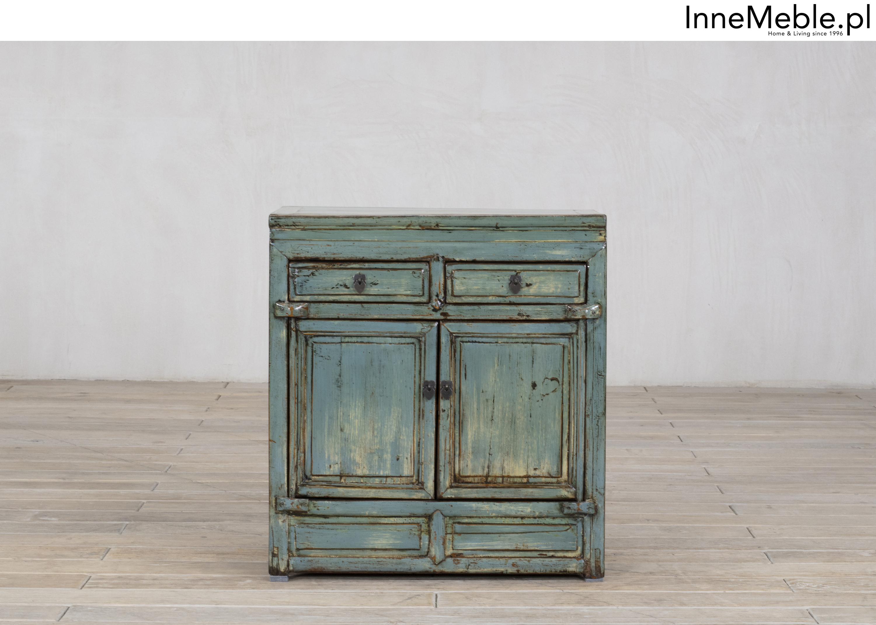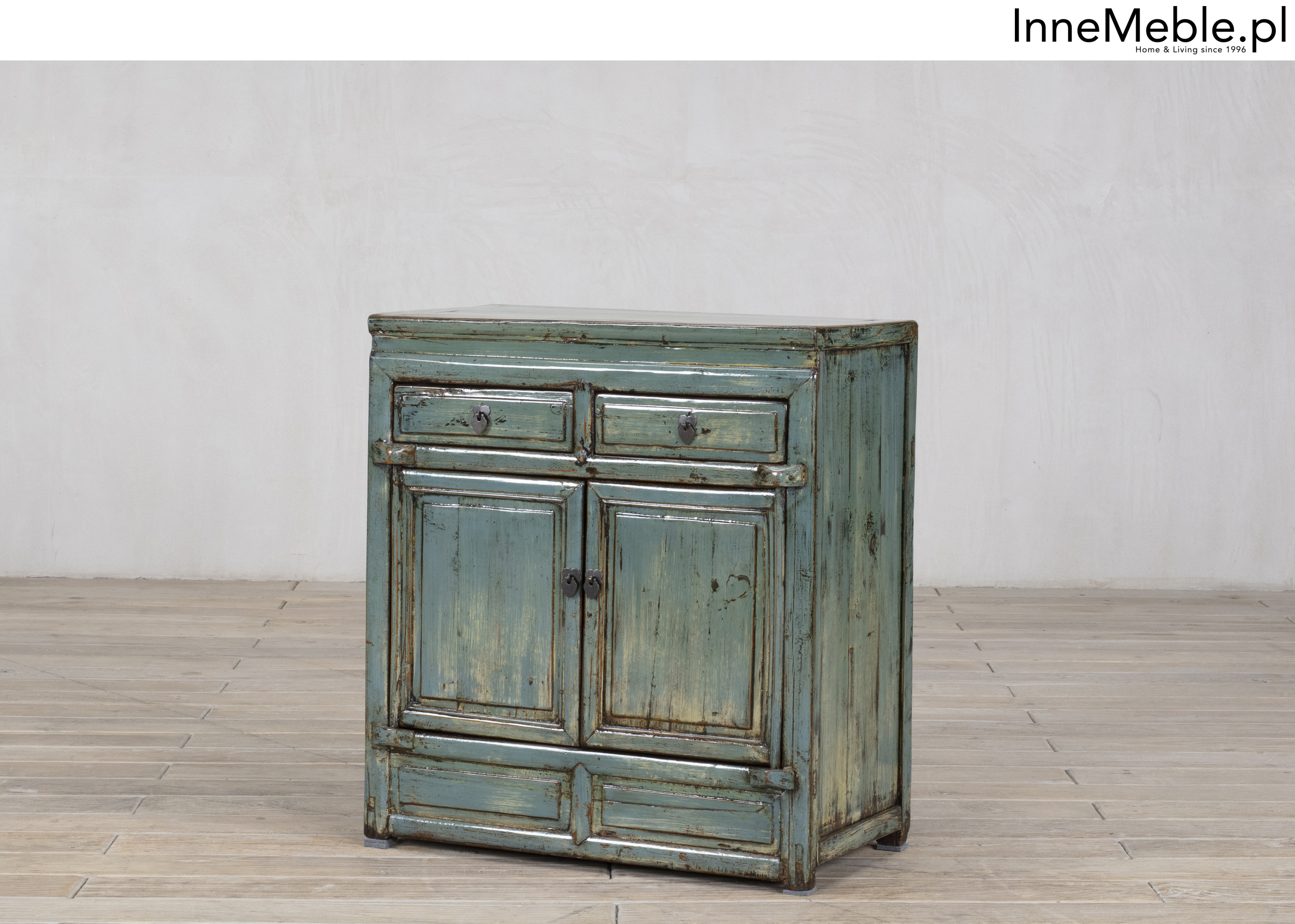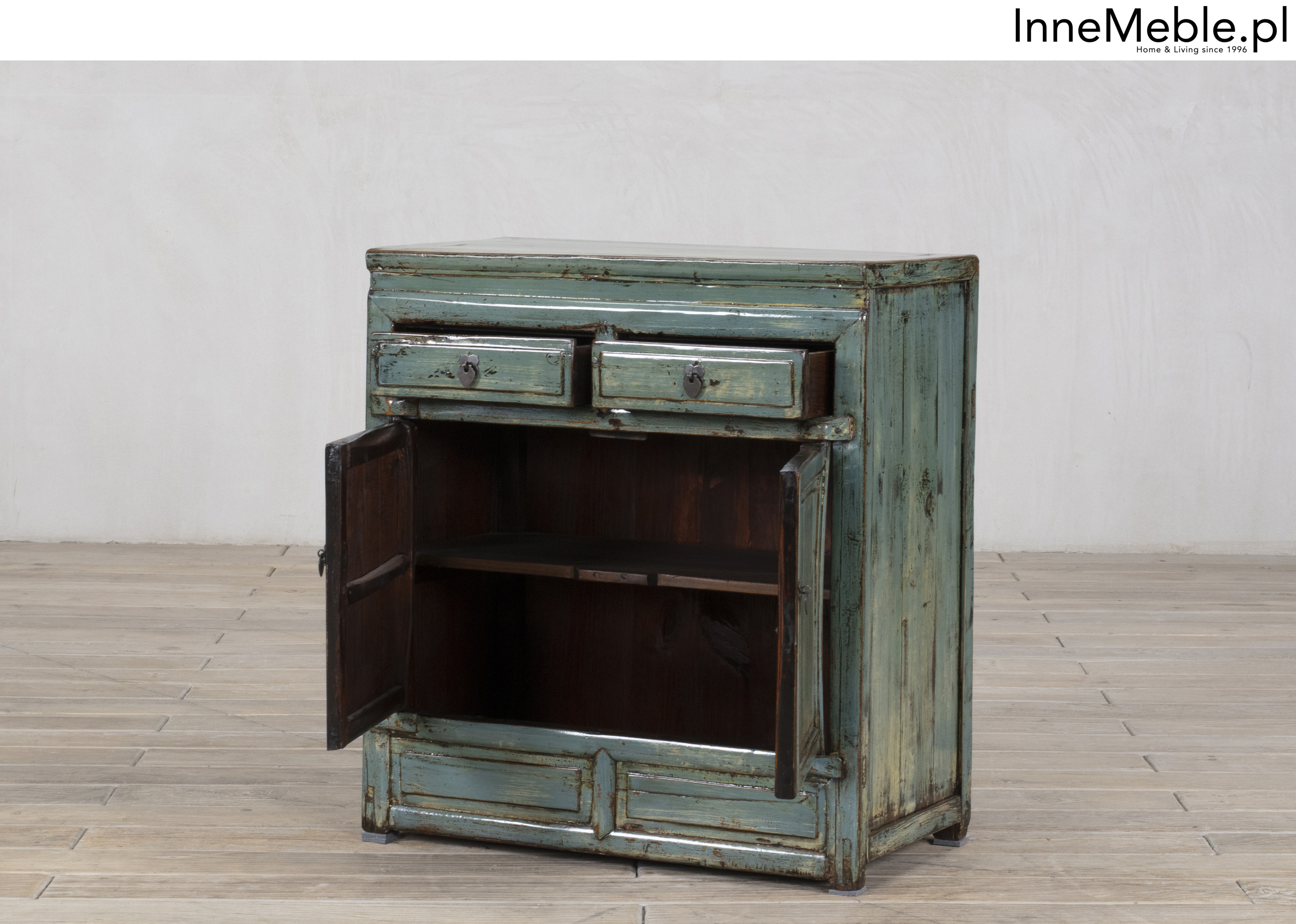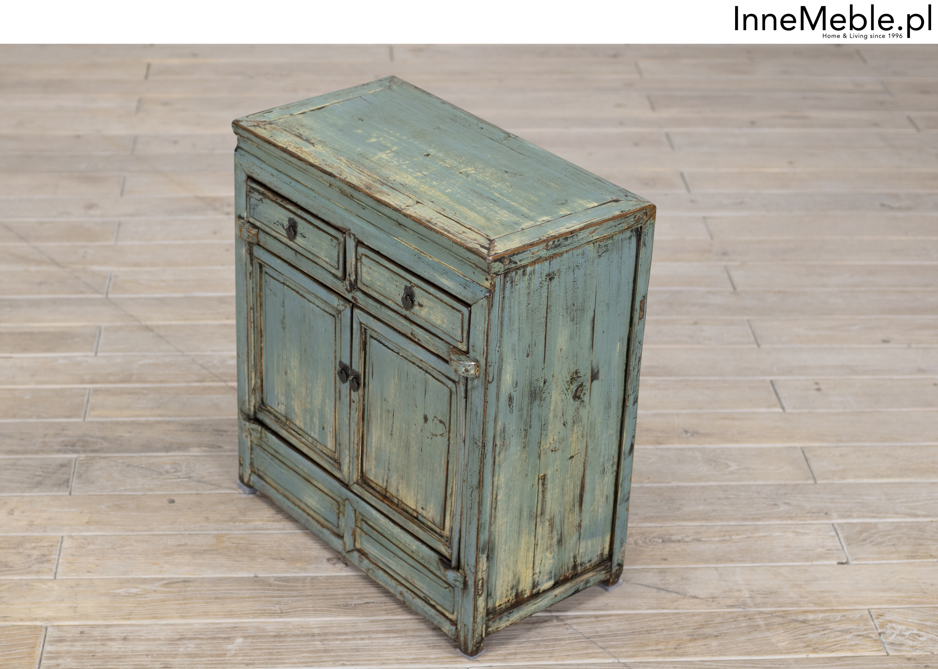 Mała komoda z szufladami w kolorze niebiesko turkusowym