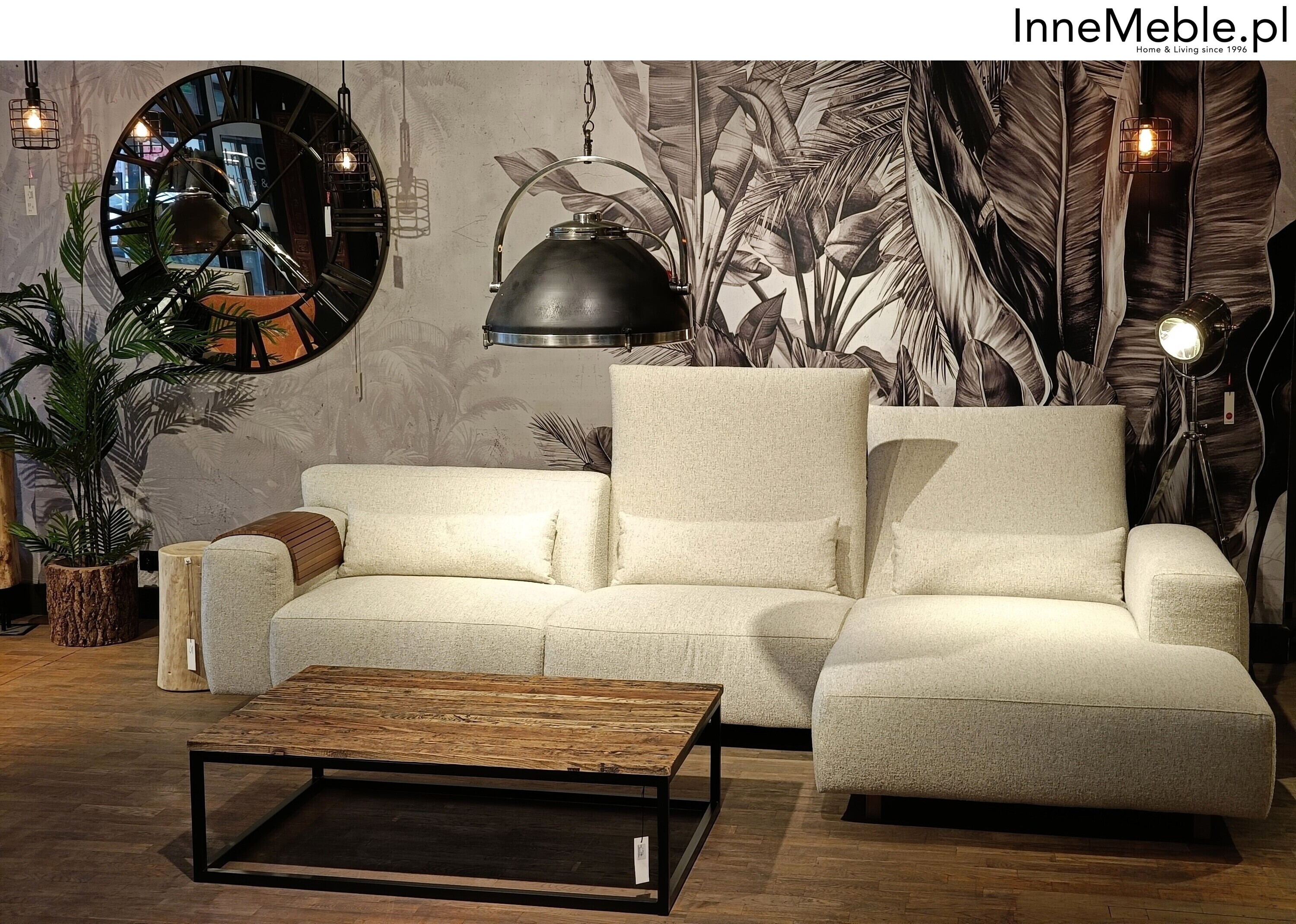 Na zdjęciu narożnik prezentuje się w wyjątkowej aranżacji – z designerskim stołem z litego drewna, efektowną tapetą z motywem roślinnym i industrialnym oświetleniem, które podkreślają jego unikalny charakter.
