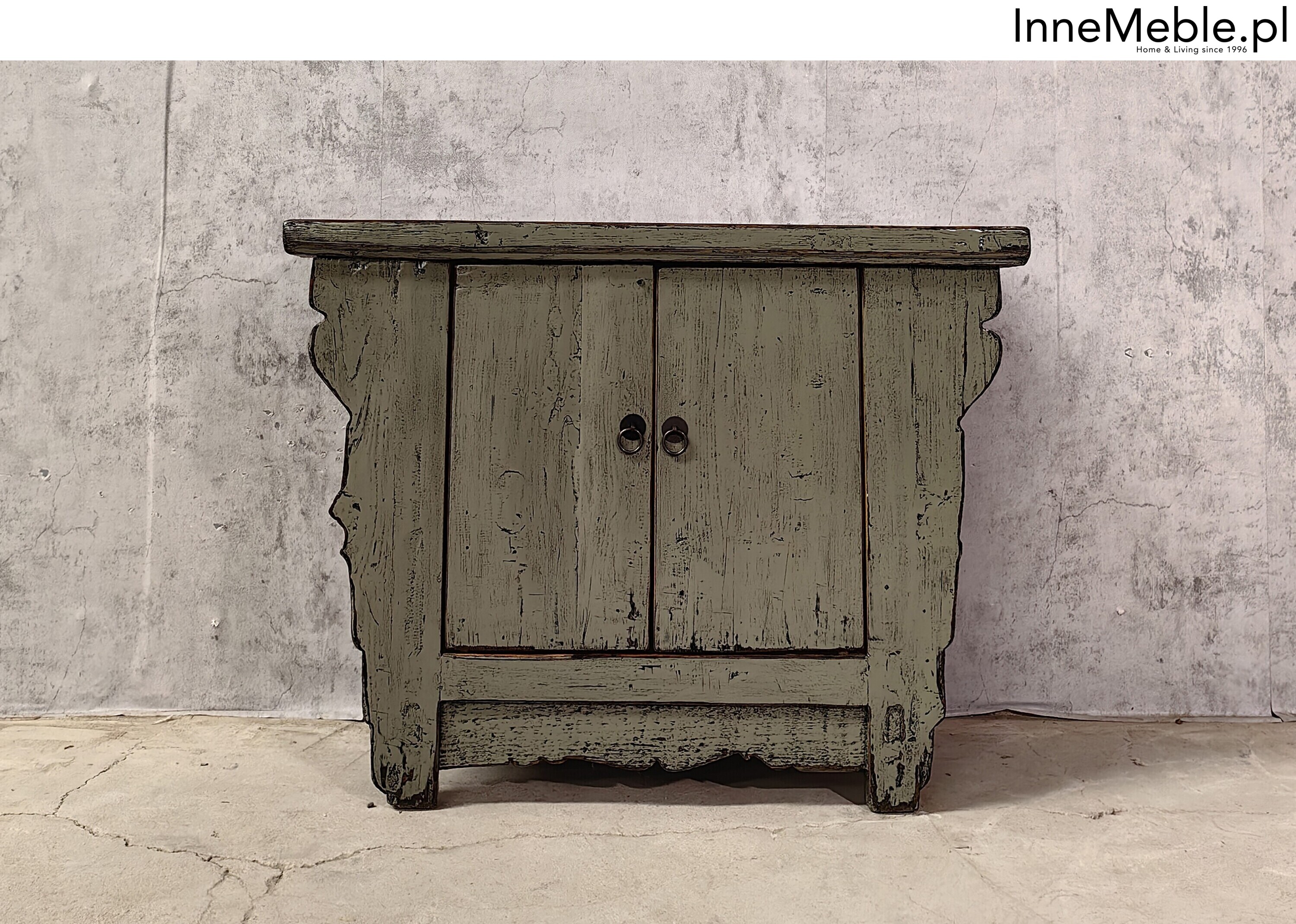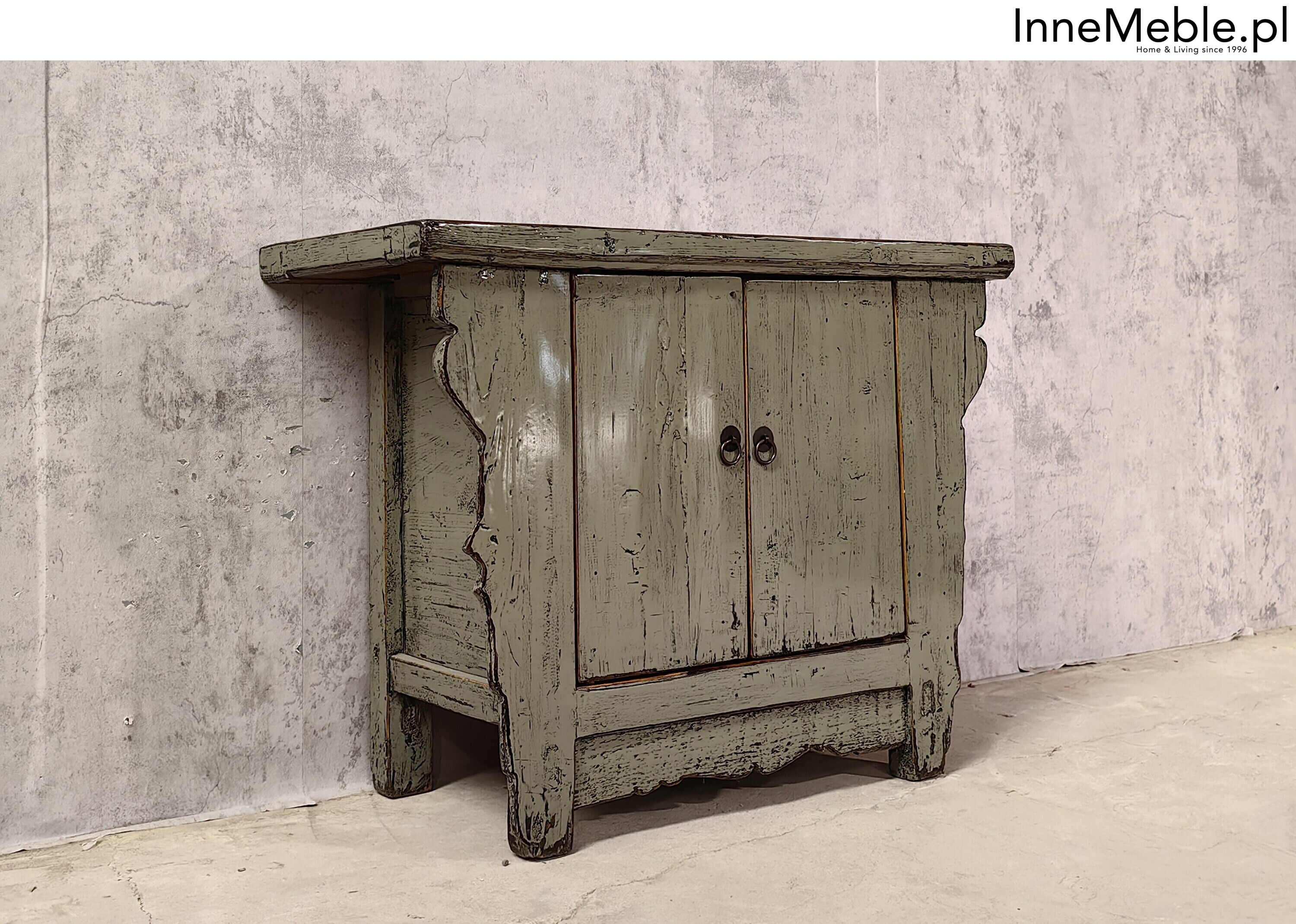 Szara komoda mała antyk z Chin, ciekawe meble, szafka z drewna, komoda drewniana szara