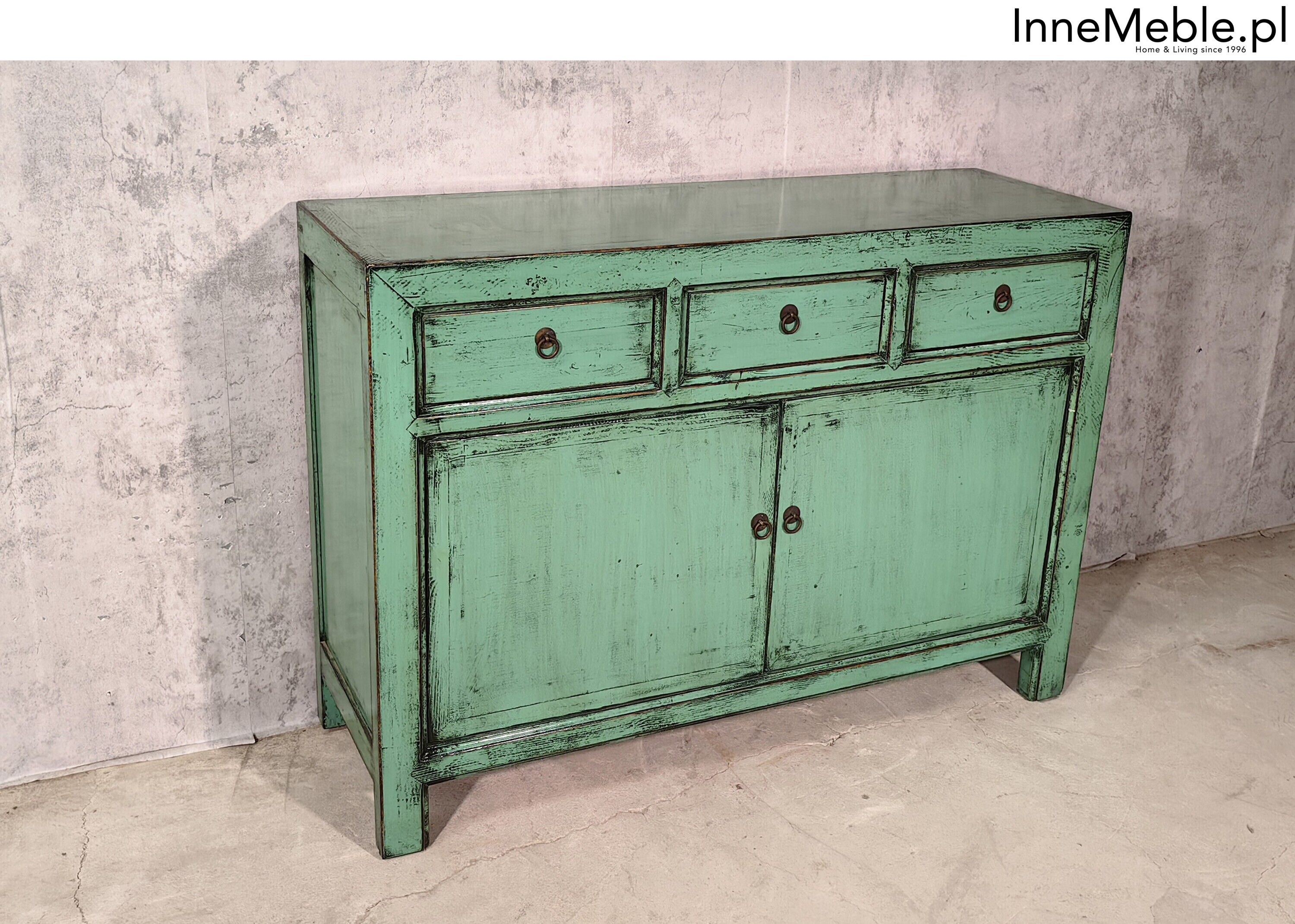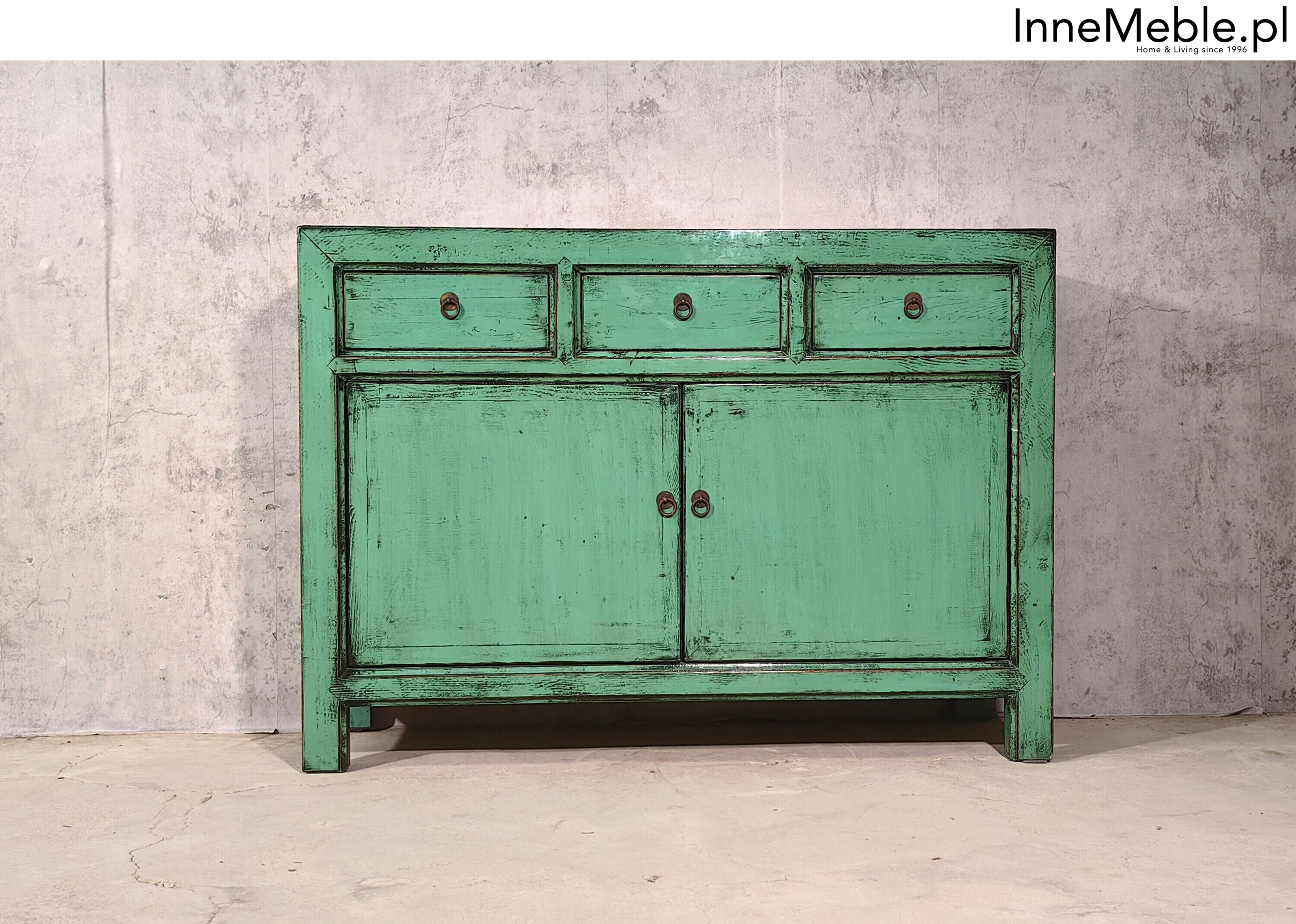 Zielona komoda z szufladami, turkusowa komoda z drzwiami, drewno,