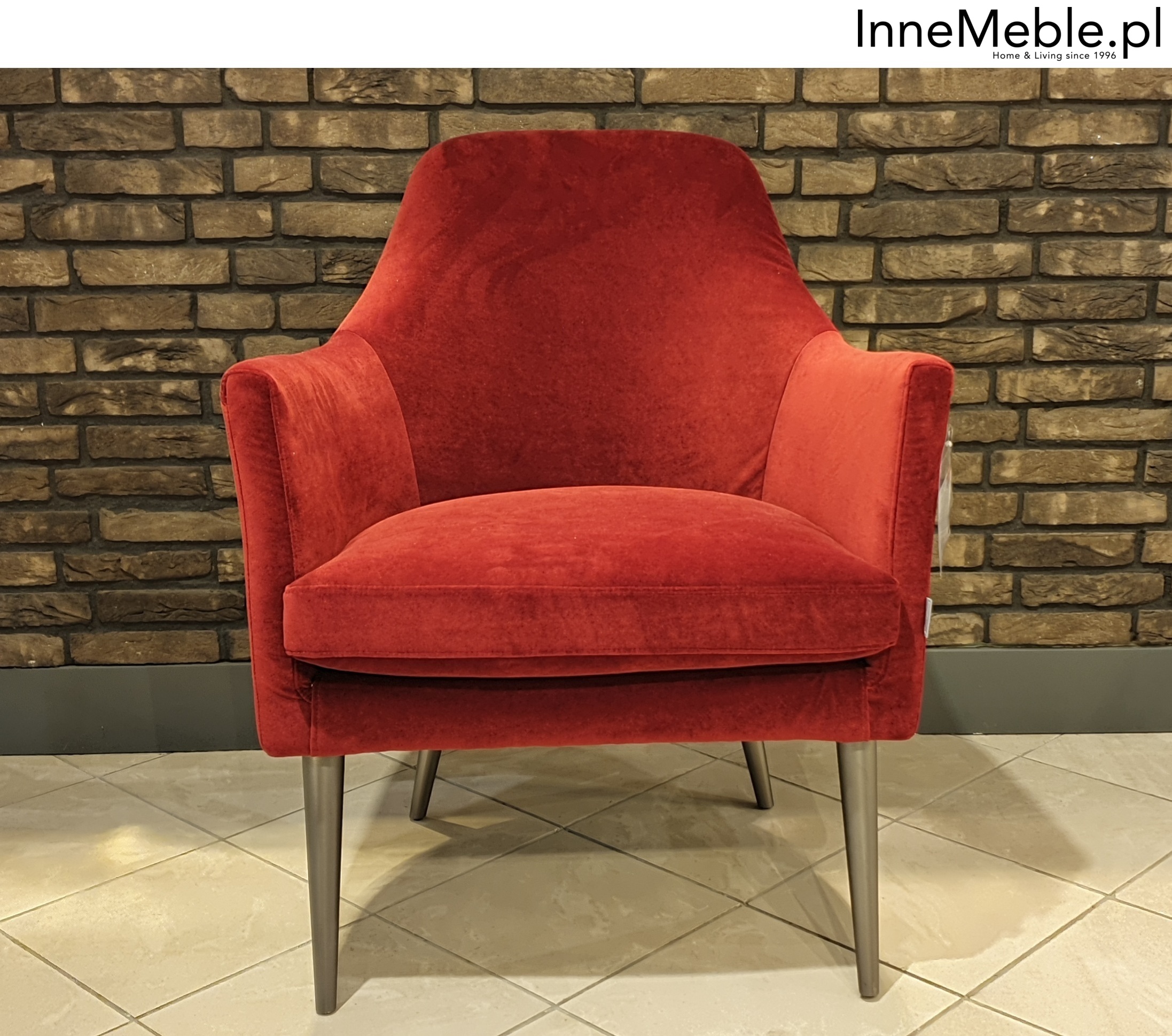 Czerwony mały fotel, metalowe nogi, do sypialni