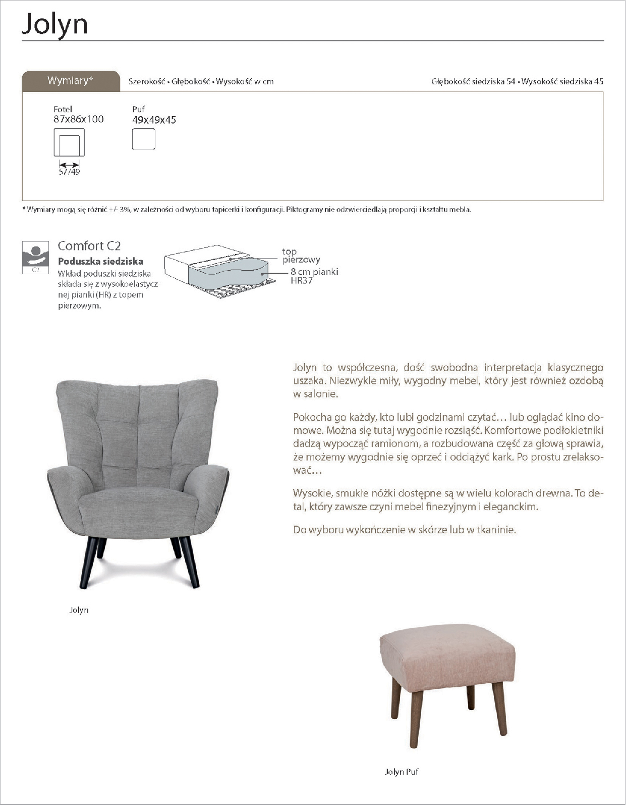 Jolyn to współczesna, dość swobodna interpretacja klasycznego uszaka. Niezwykle miły, wygodny mebel, który jest również ozdobą w salonie. Pokocha go każdy, kto lubi godzinami czytać… lub oglądać kino domowe. Można się tutaj wygodnie rozsiąść. Komfortowe podłokietniki dadzą wypocząć ramionom, a rozbudowana część za głową sprawia, że możemy wygodnie się oprzeć i odciążyć kark. Po prostu zrelaksować… Wysokie, smukłe nóżki dostępne są w wielu kolorach drewna. To detal, który zawsze czyni mebel finezyjnym i eleganckim. Fotel nie jest wykonywane w tkaninach wzorzystych (krata, kwiaty, pasy).