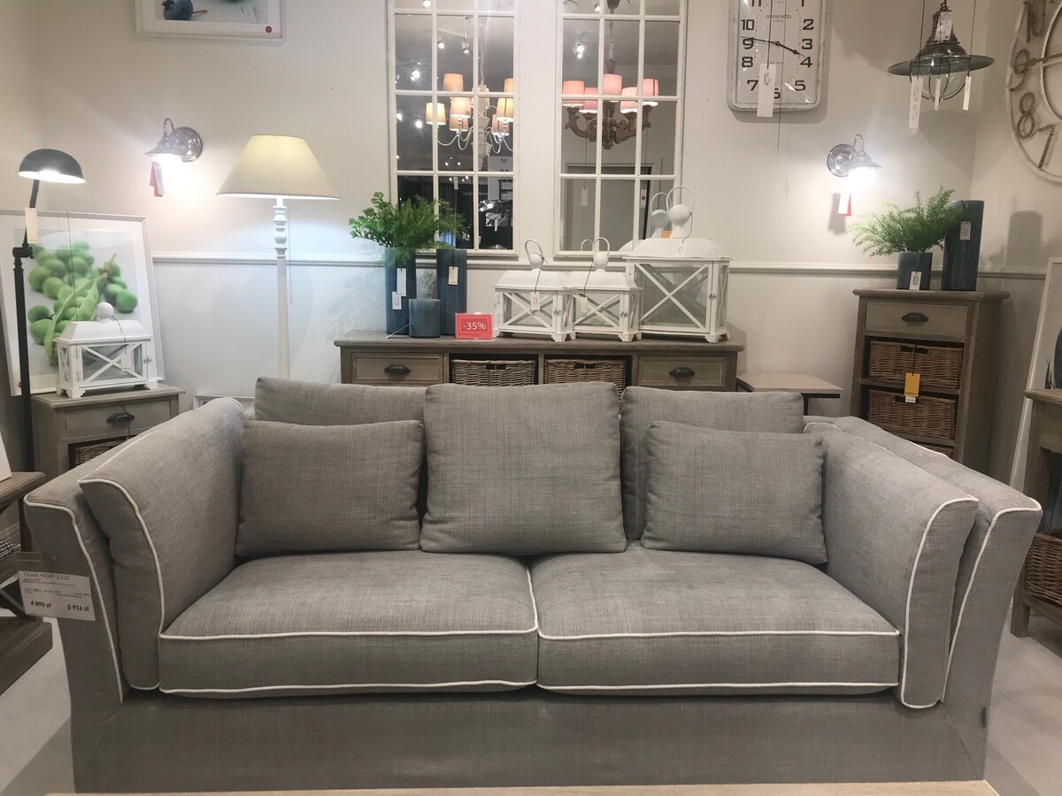 Szara kanapa, sofa z luźnym pokrowcem
