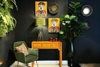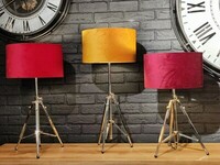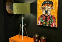 srebrna lampa na trójnogu, kolorowe abażury, pomarańczowa konsola, kolory we wnętrzu, obraz z buldogiem, zielony fotelobrotowy, lampa do gabinetu, 3.02 MB72 DPI