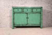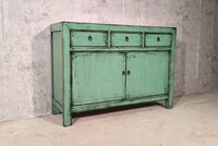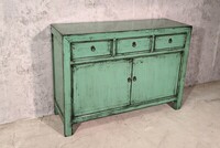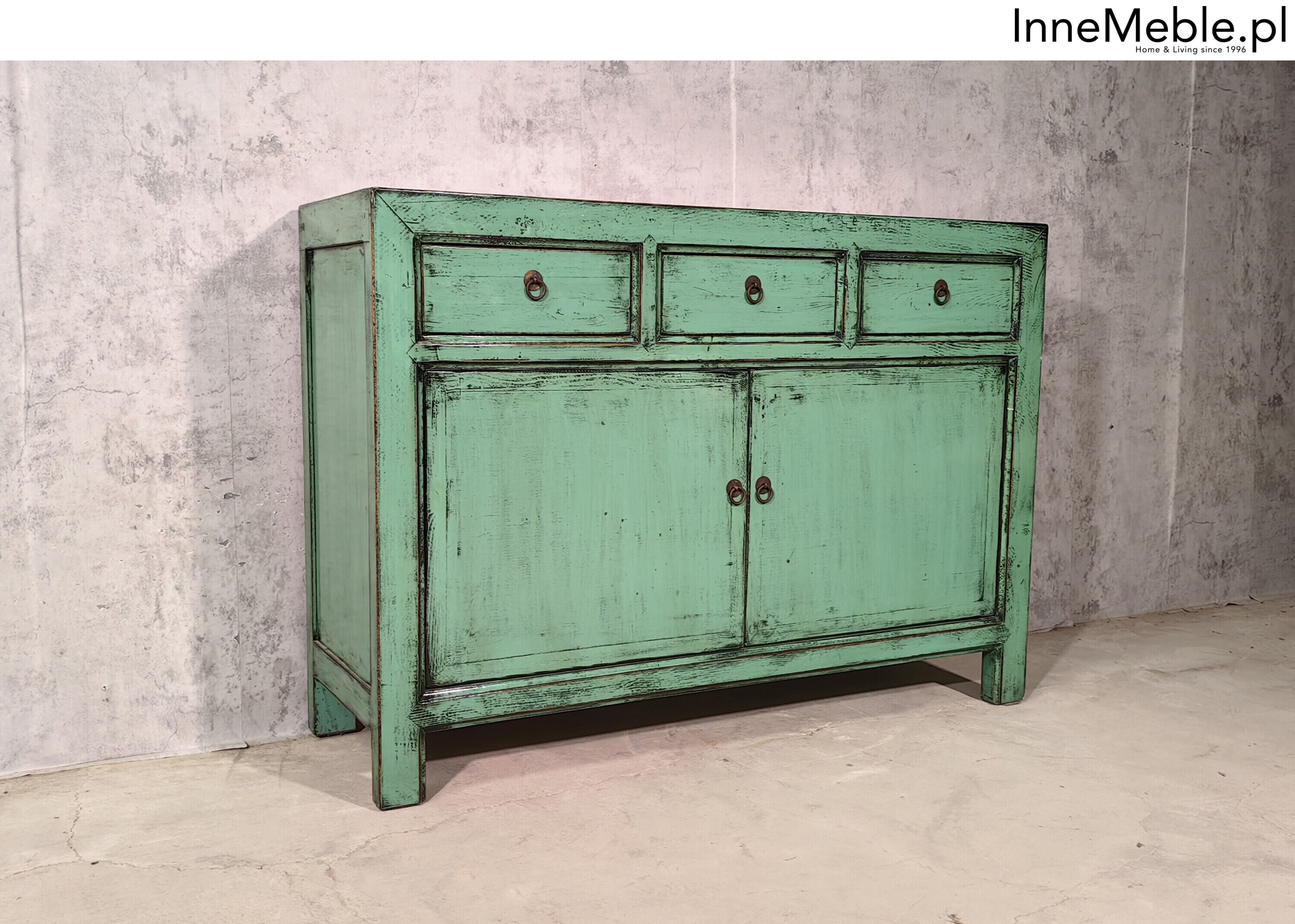 Zielona komoda z szufladami, turkusowa komoda z drzwiami, drewno,